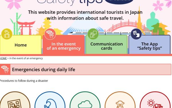 "Safty Tips" for travellers Japan National Tourism Organization(JNTO) has made a site for travel safty tips during you visit. https://www.jnto.go.jp/safety-tips/eng/